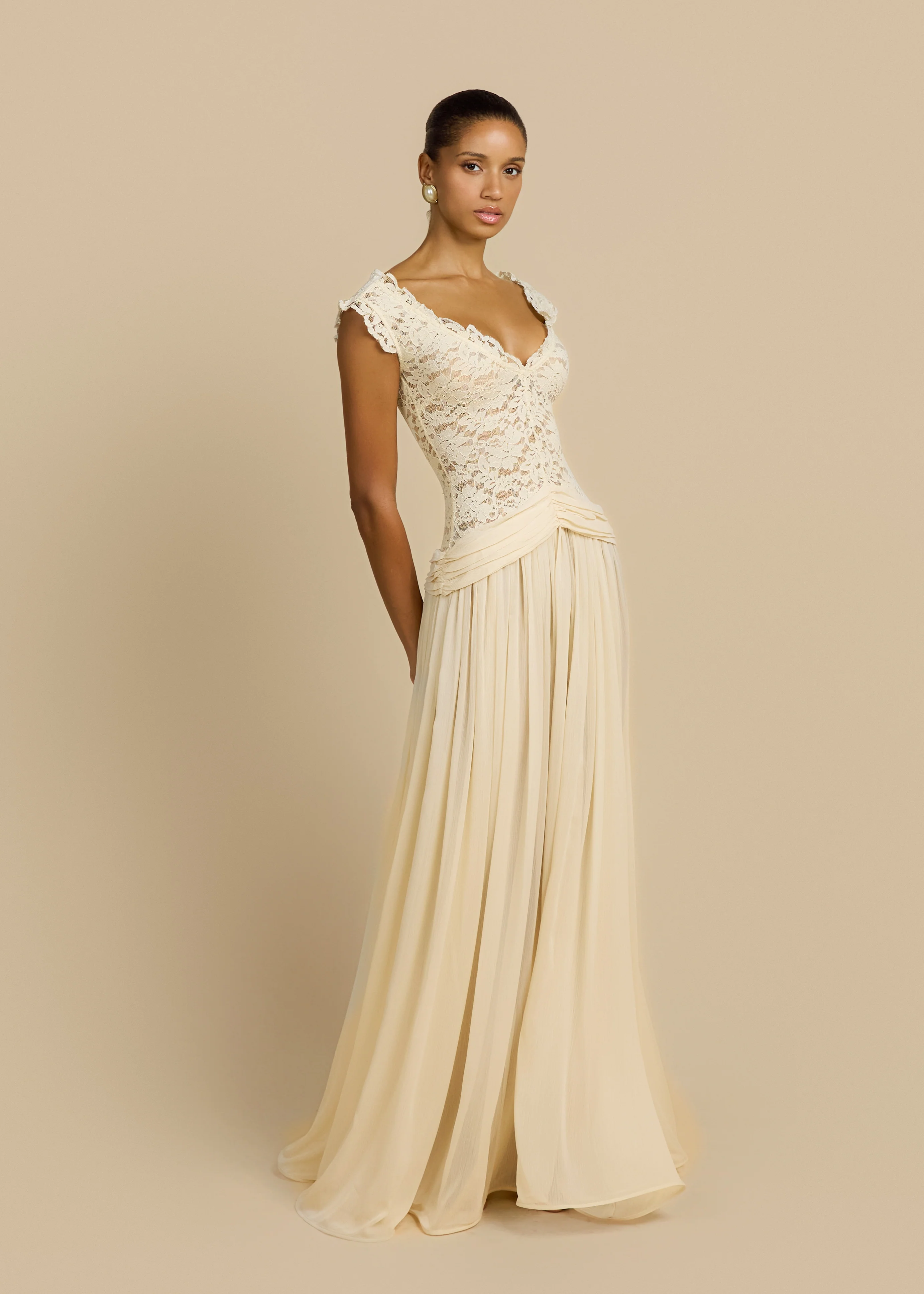 A statement of contemporary elegance with a touch of French vintage romance, Arabella is a floor-length gown designed to captivate. Crafted with a fitted lace bodice and wide off-shoulder straps, she frames the décolletage while reflecting timeless sophistication. From the waist, a sheer skirt cascades gracefully, subtly revealing the legs. The hem is lightly structured to create gentle volume and graceful movement as you walk.
