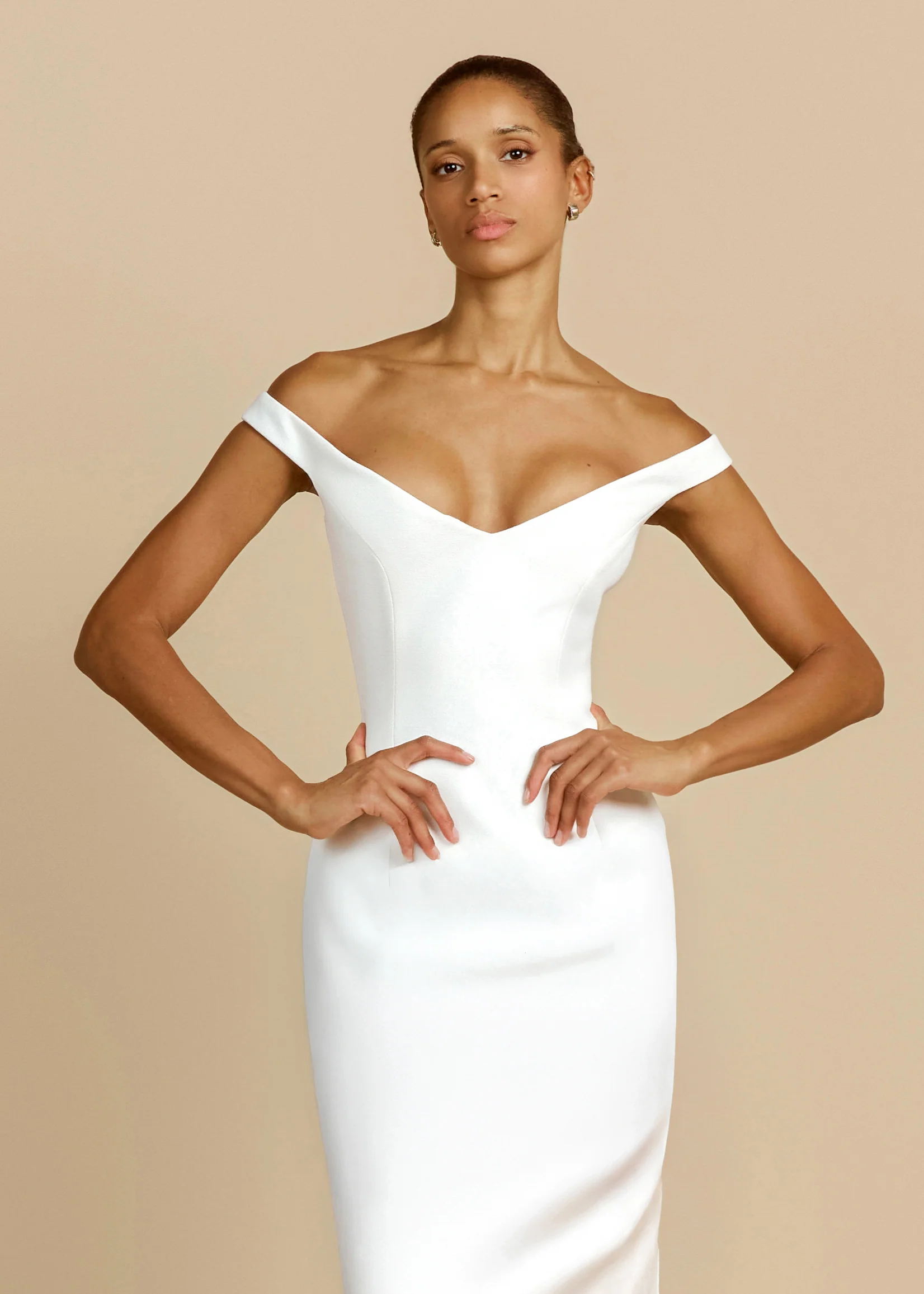 Striking in simplicity, the Ellery Dress is a maxi in an ivory hue designed to contour and flatter. Crafted from a sculpting crepe, she features an effortless off-shoulder neckline that flatters the décolletage, before descending into a floor-length dress with a high back split for ease of movement. Elegant yet timeless, Ellery is made for lasting moments.