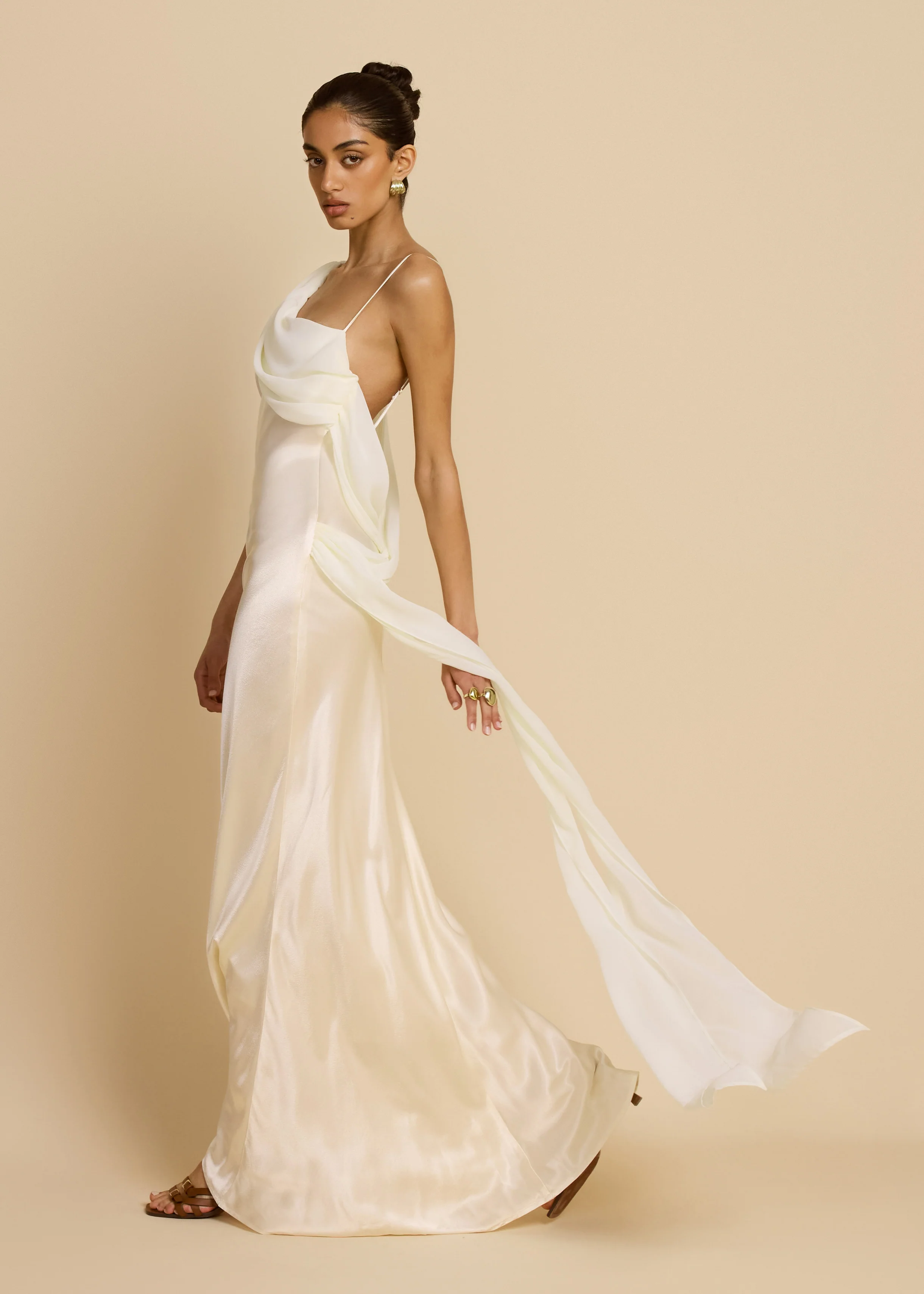 The Helena Gown blends flowing chiffon with smooth silky satin for an effortlessly feminine look. Featuring a classic full-length silhouette and an elevated asymmetric neckline, she drapes beautifully across the body. Soft contrast chiffon sweeps across the bust and shoulder, flowing into a sash that trails elegantly along the back. Complete with a sensual open back and an ethereal finish, Helena is made for your special moments.