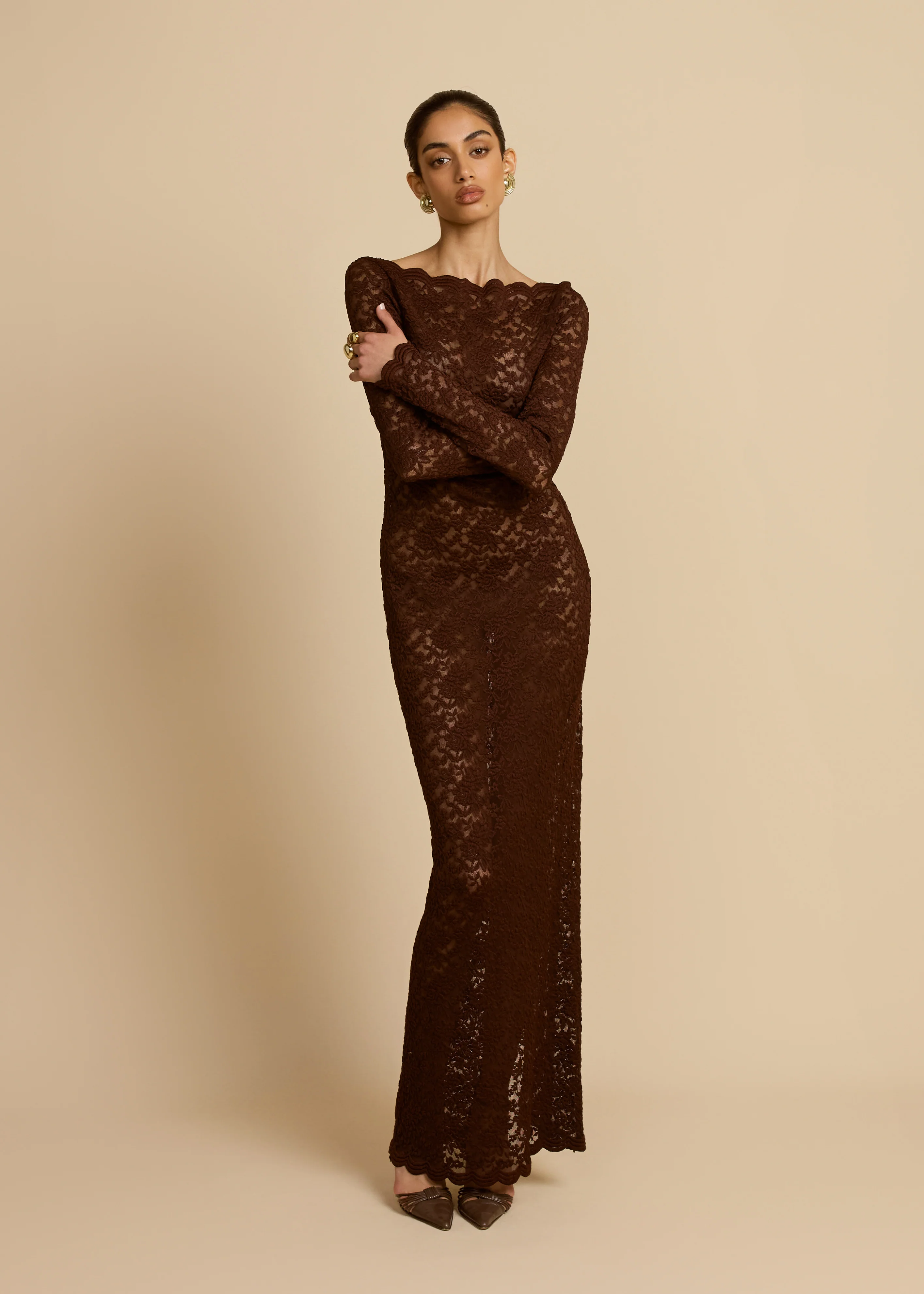 Monet blends delicate details with timelessness. Crafted from vintage-inspired chocolate lace, she reveals intricate scalloped edges and a classic boat neckline. Her long sleeve silhouette gently embraces the feminine form and flows into a graceful maxi with a center-back split. Complete with a delicate button closure and a subtly sheer finish, Monet is designed to leave a lasting impression.